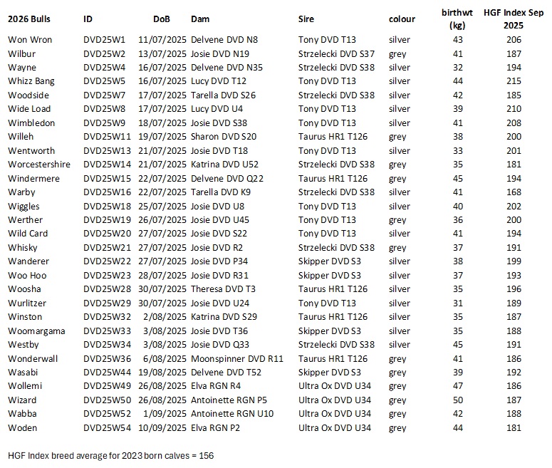 Please call Davo (mob. 0459 999 662, new email address This email address is being protected from spambots. You need JavaScript enabled to view it.) if you would like any more information about any of our young bulls or will need a bull in Spring 2025. We recommend that you register your interest early for our bulls. If you would like to be added to the mailing list for a hard copy of the catalogue for next year's sale, just let us know.